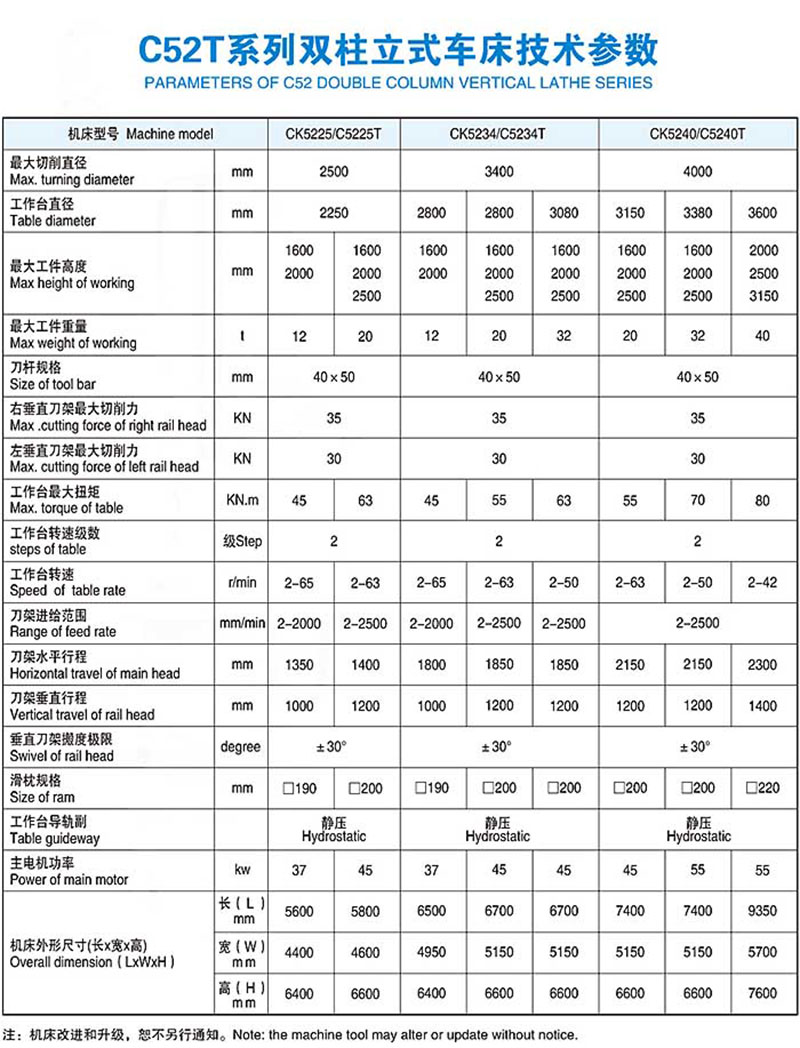 本系列机床分为普通型和数控型两种。普通型由“C52-T”表示,数控型由“C52-”表示。适用于高速钢、硬质合金刀具,对黑色金属、由